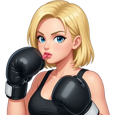 Braless boxing, blonde shoulder length haired female, android 18, from dragon ball super, in the black boxing gloves, having slobber kiss emoji