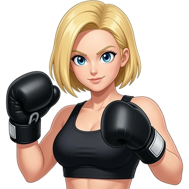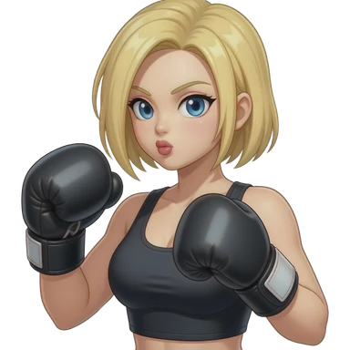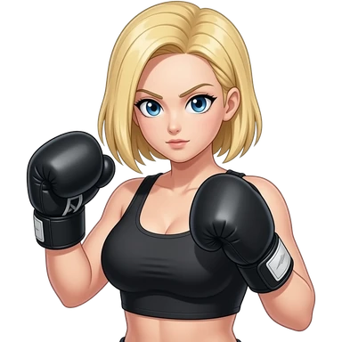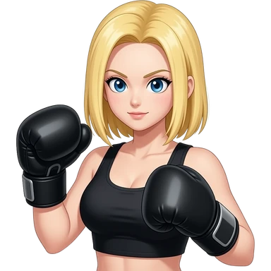 In Breast boxing, blonde shoulder length haired female, android 18, from dragon ball super, in the black boxing gloves emoji