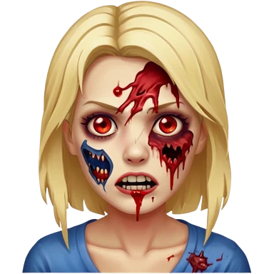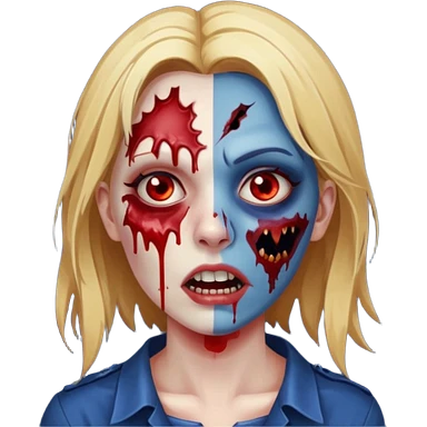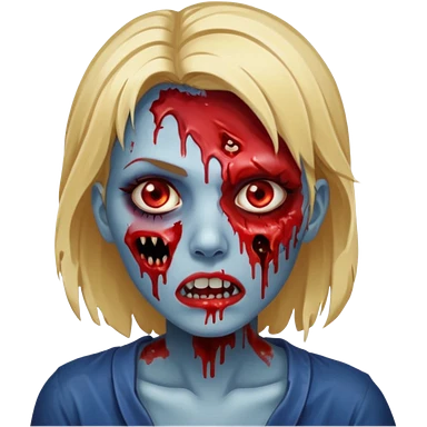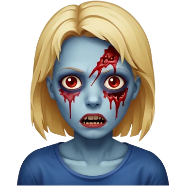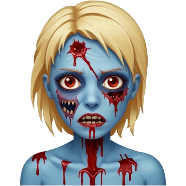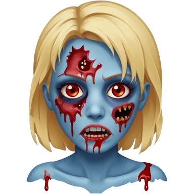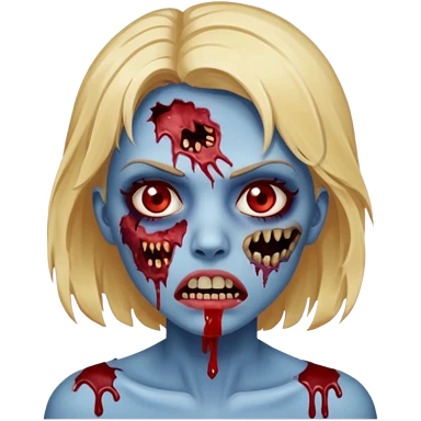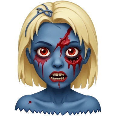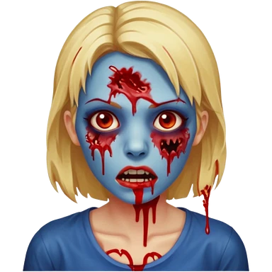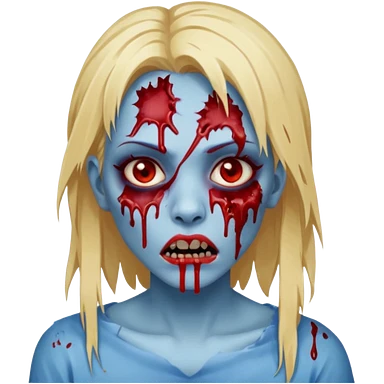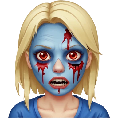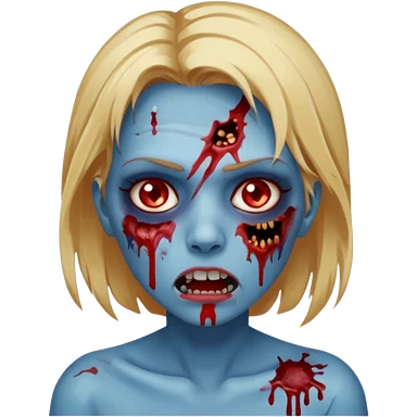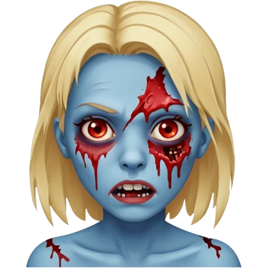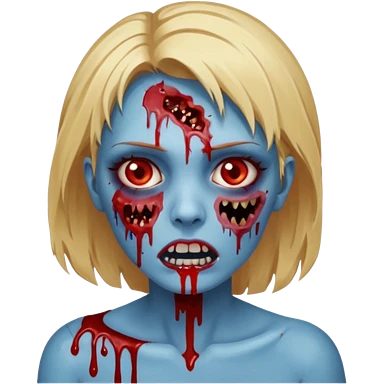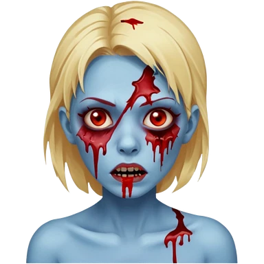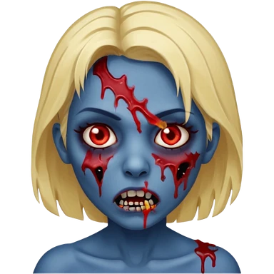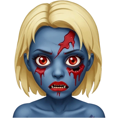 zumbi feminino com cortes no rosto, olhos baixos e vermelhos, cabelo loiro e rosto azul escuro, boca e olhos sangrando cm fundl azul e mais sangues possível emoji