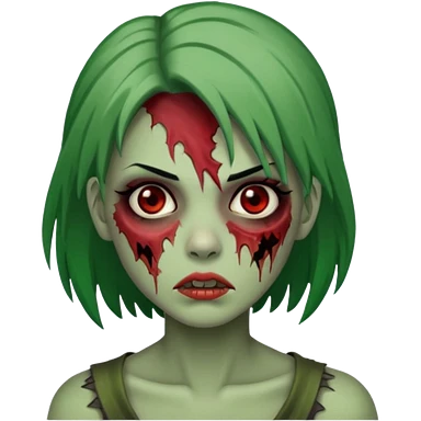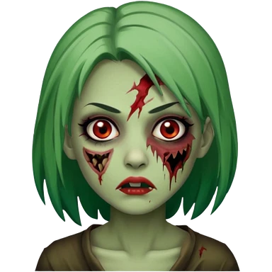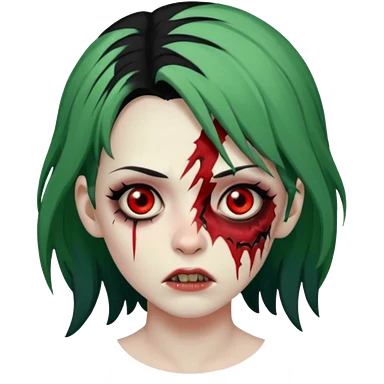 zumbi feminino com cortes no rosto, olhos baixos e vermelhos, cabelo preto e verde emoji
