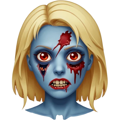 zumbi feminino com cortes no rosto, olhos baixos e vermelhos, cabelo loiro e rosto azul escuro, boca e olhos sangrando emoji
