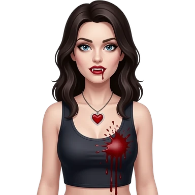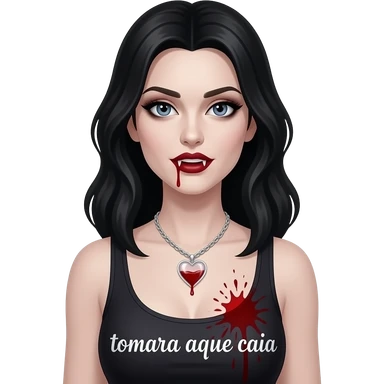 Quero uma mulher igual a personagem katherine Pierce soq mais gótica e em forma de vampira com um colar de coração simples transparente com sangue lá dentro e sangue em suas presas e borrife sangue perto de seus seios, deixe ela com um top reto sem mangas e o colar menor emoji
