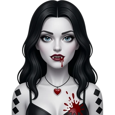 Quero uma mulher igual a personagem katherine Pierce soq mais gótica e em forma de vampira com um colar de coração simples transparente com sangue lá dentro e sangue em suas presas e borrife sangue perto de seus seios, deixe ela com um top "tomara que caia" e o colar menor emoji