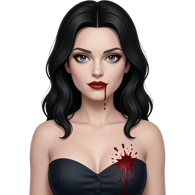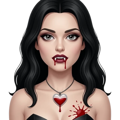 Faça uma mulher igual a katherine Pierce em forma de vampira com cabelos longos pretos seis marcando top tomara que caia sangue borrifado perto dos seios e colar minimalista e pequeno de coração transparente com sangue dentro emoji