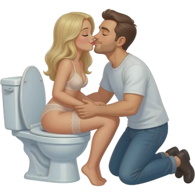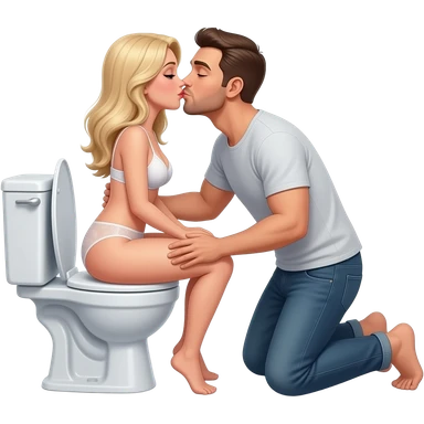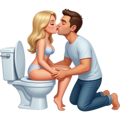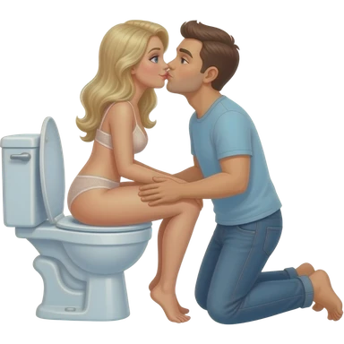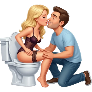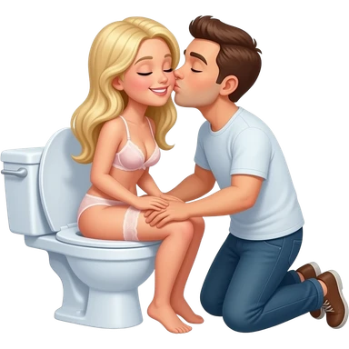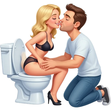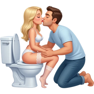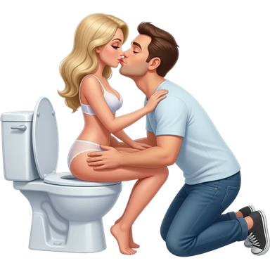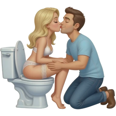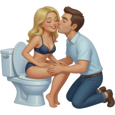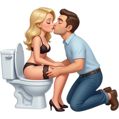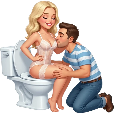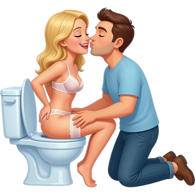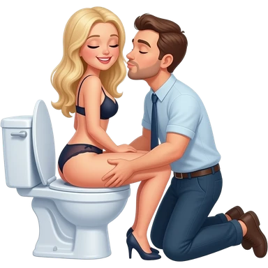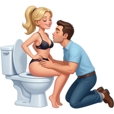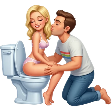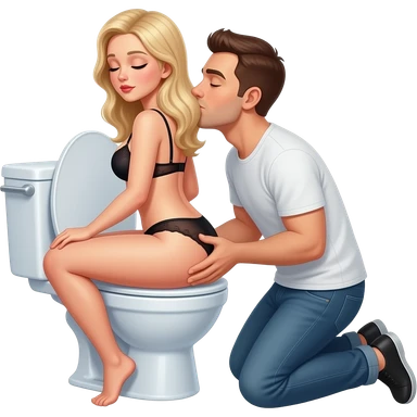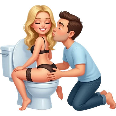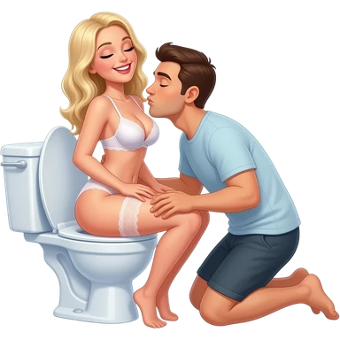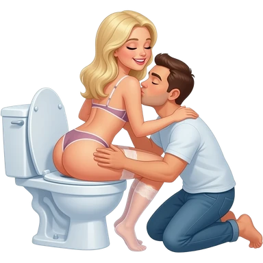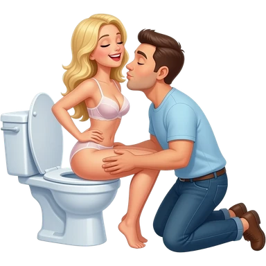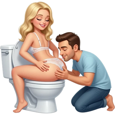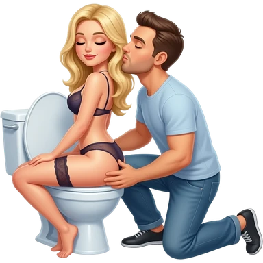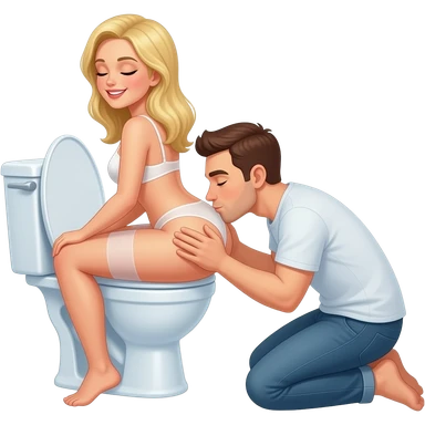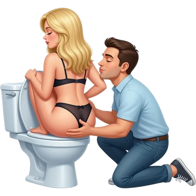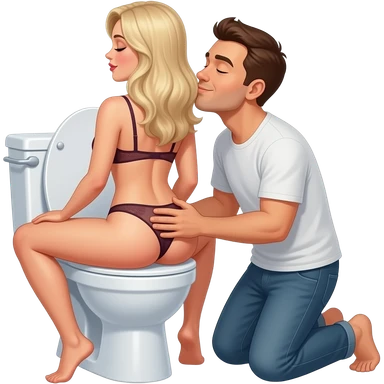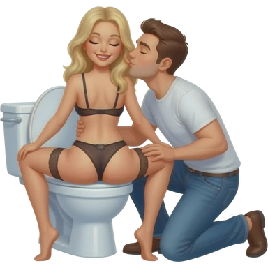 White blonde woman in lingerie sits reverse on open toilet while man knees behind her kissing her butt. Eyes closed emoji