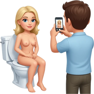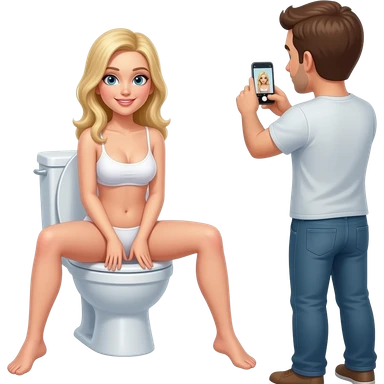 A naked white blonde woman sits on the toilet taking a picture of her crotch. She is looking at the camera. A man takes a picture. Her legs are spread emoji