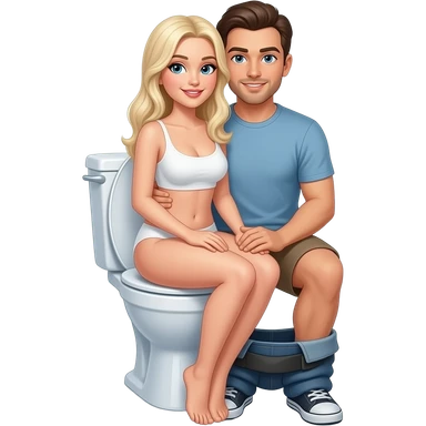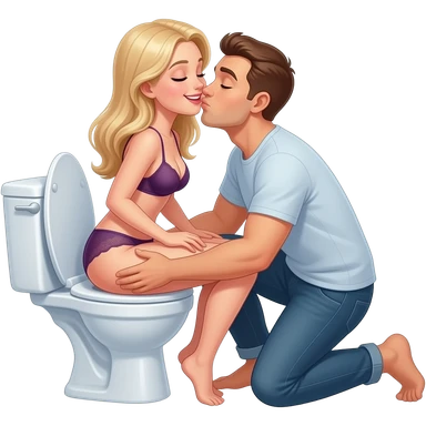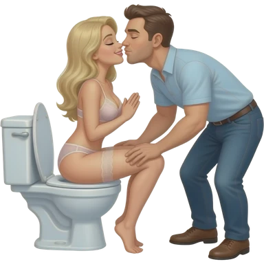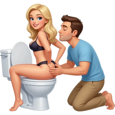 A naked white blonde female squatting reverse over toilet. A man kissing her butt and holding breasts. Eyes closed. Smiling. Lingerie. Toilet seat open emoji