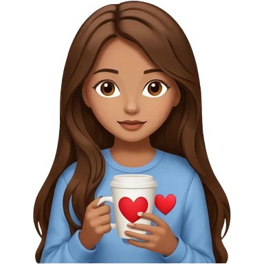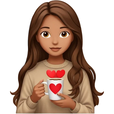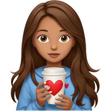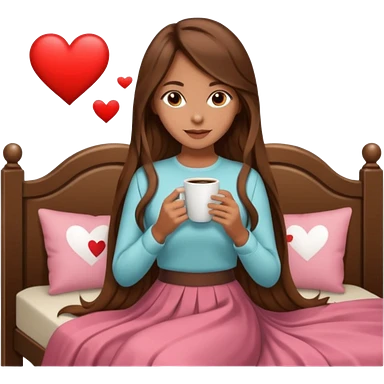 Un emoji de una chica con el pelo castaño y largo y suelto así como vestida como una that Girl y un café con dibujo de corazón y una cama aesthetic modo vida perfecta emoji