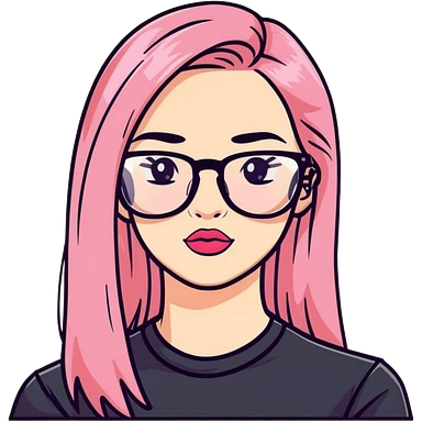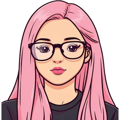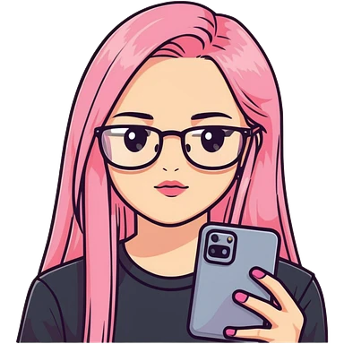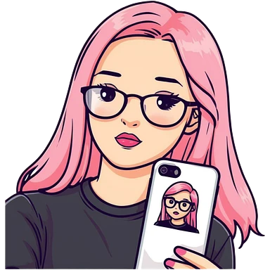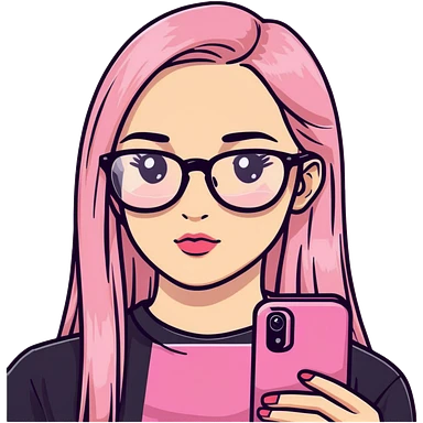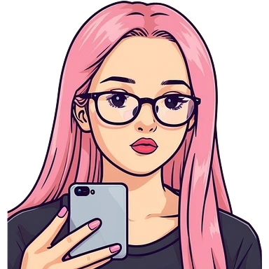 Teenage girl taking a selfie in a school bathroom. Long straight blonde hair with pink dye, rectangular glasses, black shirt, neutral expression with slightly glossy lips emoji
