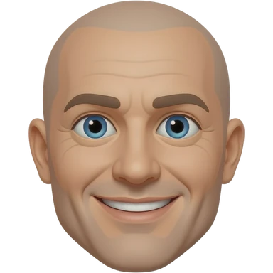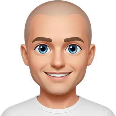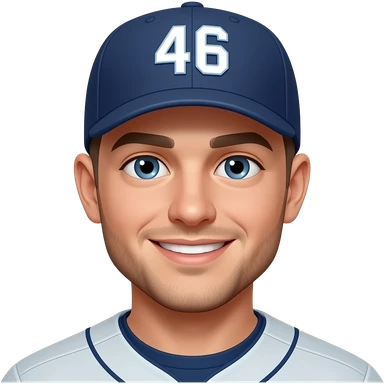 face of a young bald man with blue eyes, smiling, wearing a baseball cap with number 46 on it emoji