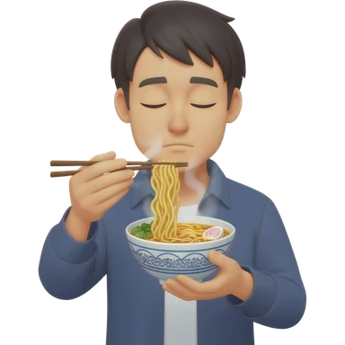 Japanese guy with eyes closed eating noodles emoji