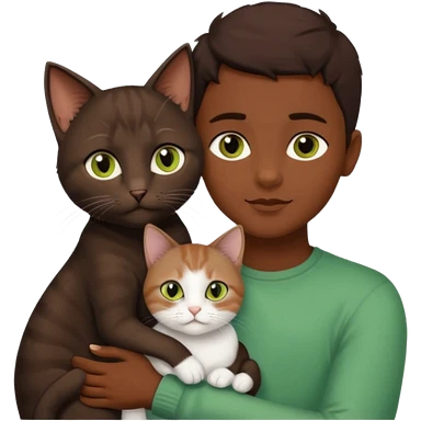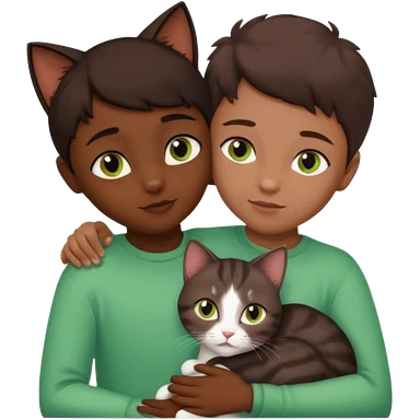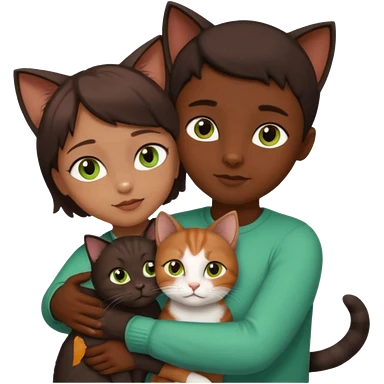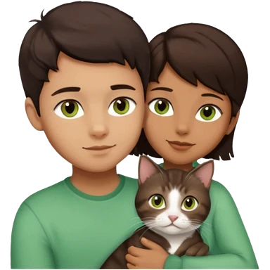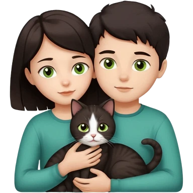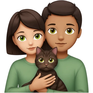 Crea un emoji donde salga un chico moreno con los ojos claros, una chica morena con los ojos marrones y SOLO UN gato europeo comun de pelaje oscuro y ojos verde claro, quiero que se esten abrazando y el gato este en el medio de los dos emoji