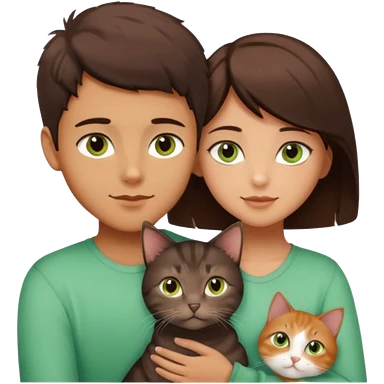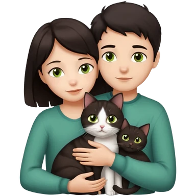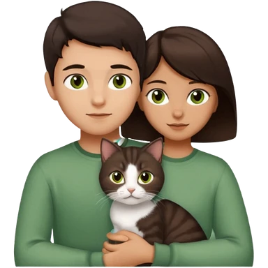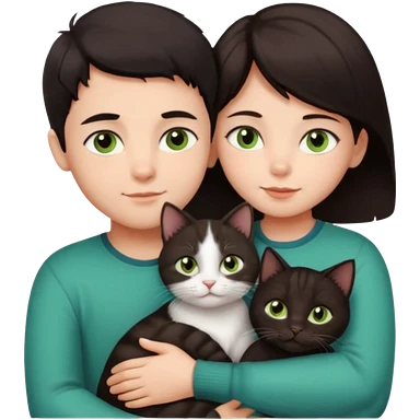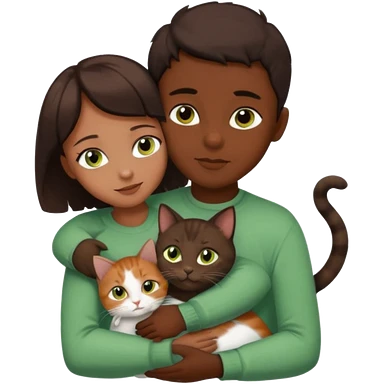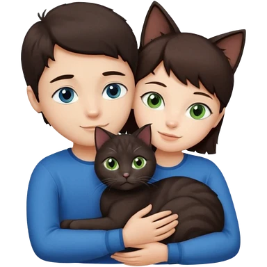 Crea un emoji donde salga un chico moreno con los ojos claros, una chica morena con los ojos marrones y SOLO UN gato europeo comun de pelaje oscuro y ojos verde claro, quiero que se esten abrazando y el gato este en el medio del chico y la chica emoji