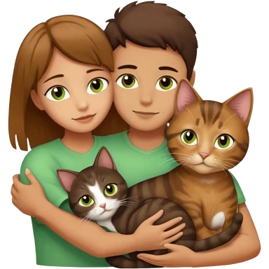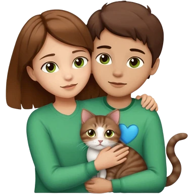 Crea un emoji donde salga un chico de pelo moreno con los ojos claros, una chica de pelo morena con los ojos marrones y UN gato europeo comun de pelaje marron oscuro y ojos verde claro, quiero que se esten abrazando el chico y la chica, y el gato este en el medio de los dos emoji