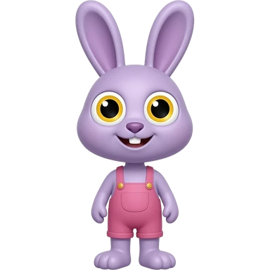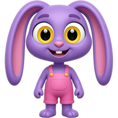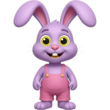 Purple cartoon bunny rabbit, with wide yellow eyes, black rectangular pupils, yellow smiles, wearing pink overalls, long thin neck emoji