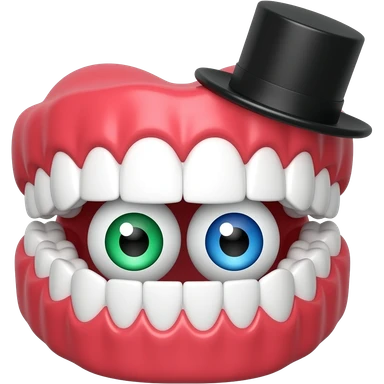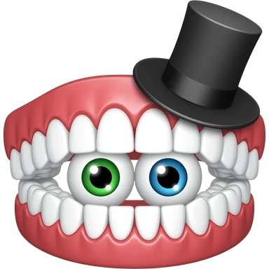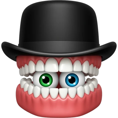 Set of dentures with red gums, eyes placed within the jaw, one green eye, one blue eye, wearing a small black top hat emoji