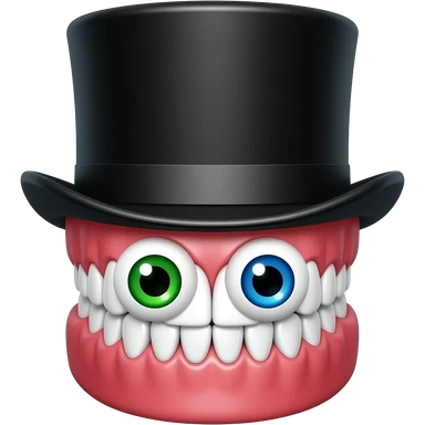 Set of dentures with red gums, eyes placed within the jaw, one green eye, one blue eye, wearing a black top hat emoji