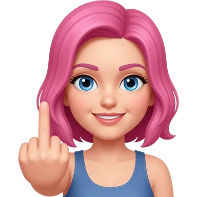 Woman with pink hair and blue eyes giving the finger emoji