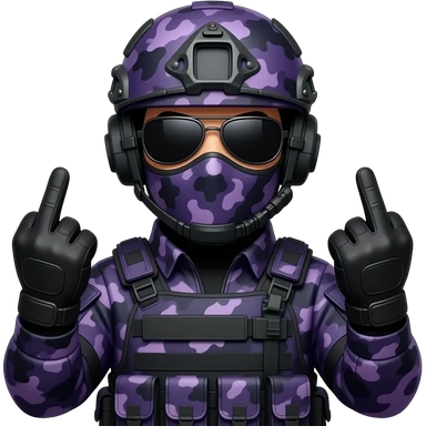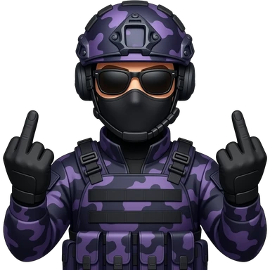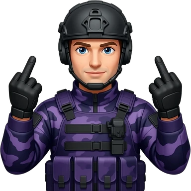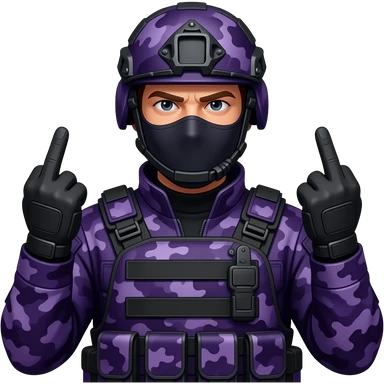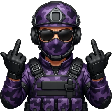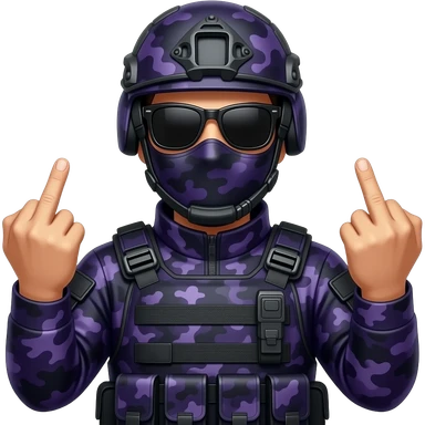 Man in dark purple camoflage tactical gear giving the finger two times emoji