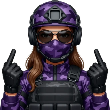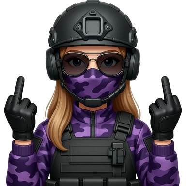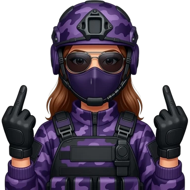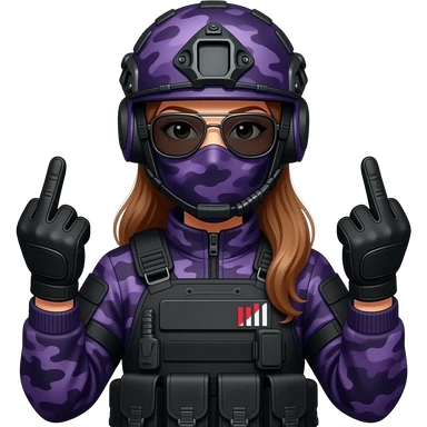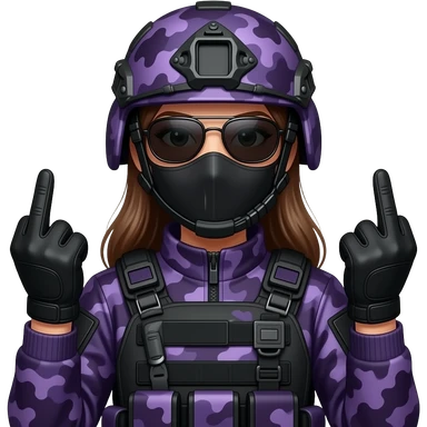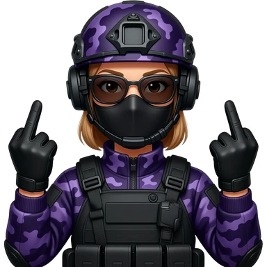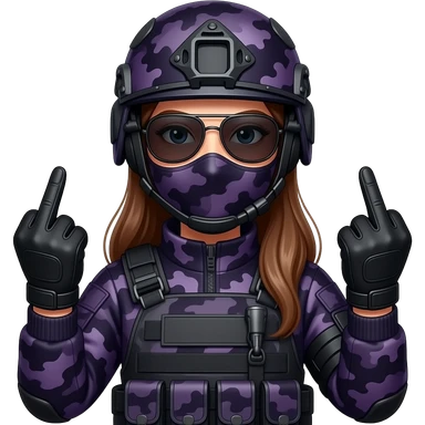 Woman in large black aviator sunglasses dark purple camoflage tactical gear helmet and mask giving the finger two times in black gloves emoji