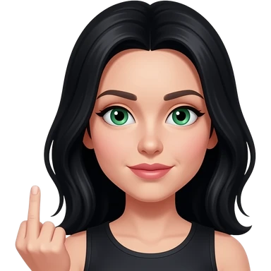 Angry Pale Woman with long black hair and green eyes giving the finger emoji