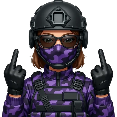 Man in dark purple camoflage tactical gear helmet and mask giving the finger two times emoji