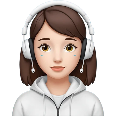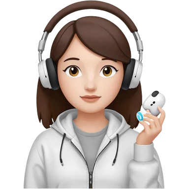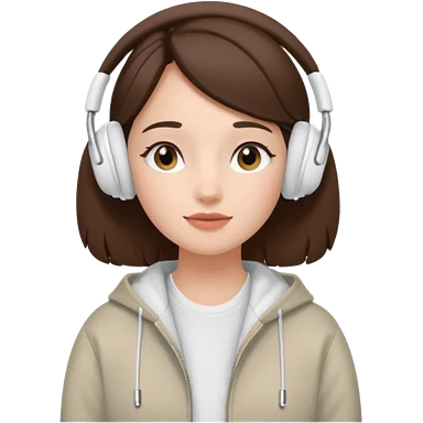 A clean, minimal emoji-style illustration of a light-skinned girl with brown hair worn loose. Her eyes are closed while listening to music with silver AirPods Max. She’s wearing a white zip-up hoodie. Smooth 3D emoji style, soft lighting, neutral tones. emoji