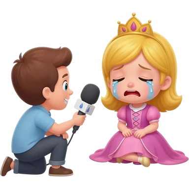 fes una princesa petita que estigi aseguda al terra plorant i una entrevistadora la vingi ha enrevistar amb camara i un micro emoji