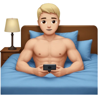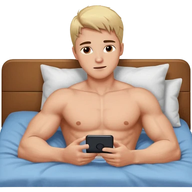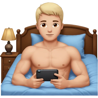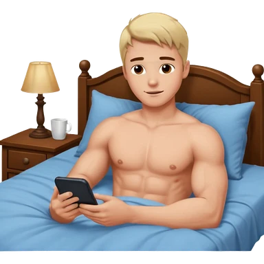парень накаченный молодой красивый парень со светлыми волосами и черно кориченывыми глазами без футболки лежит на кровати и листает телефон emoji