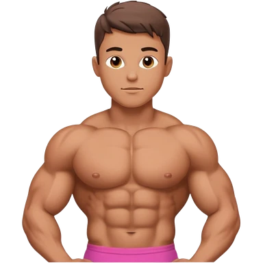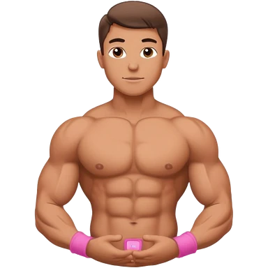 крупным планом торс молодого накаченного парня с прессом и накаченной рельефной округлой грудью с розовыми сосками и накаченными руками с банками emoji
