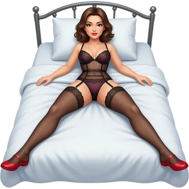 Sexy mature lady looking all sexy laid on a bed in lingerie, stockings and wearing red slippers emoji