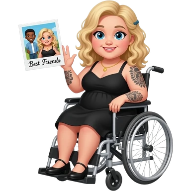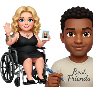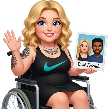 Plus size women waving in wheelchair Blonde curly hair blue eyes black tattoos a black summer dress with a Polaroid photo on dress of herself with best friend who is African American man black hair brown eyes no facial hair saying “Best Friends” in cursive writing emoji