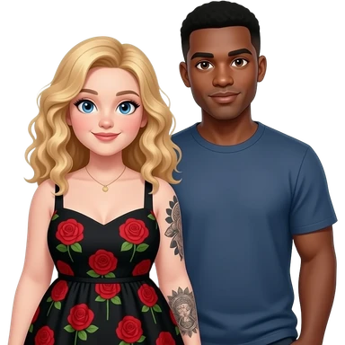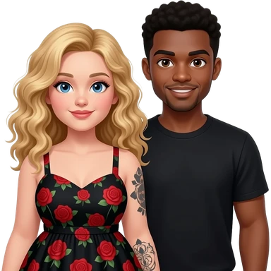 Plus size girl, Blonde curly hair, blue eyes, black tattoos on right lower arm, wearing no sleeve black summer dress with red roses & African American man with black hair, brown eyes, NO facial hair best friends emoji