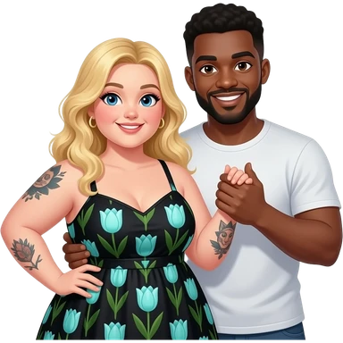Plus size Blonde girl with blue eyes tattoos arms wearing a black summer dress with teal tulips and African American man with black hair with brown eyes having fun together emoji