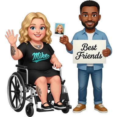 Plus size women waving in wheelchair Blonde curly hair blue eyes black tattoos on right lower arm wearing a black summer dress saying “Best Friends”in cursive teal writing above with a pitcher of a African American man with black hair brown eyes NO facial hair emoji