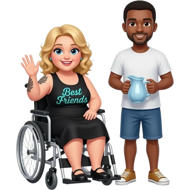 Plus size women waving in wheelchair Blonde curly hair blue eyes black tattoos on right lower arm wearing a black summer dress saying “Best Friends”in cursive teal writing above a pitcher of a African American man with black hair brown eyes NO facial hair emoji