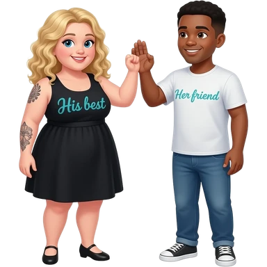 Plus size girl, Blonde curly hair, blue eyes, black tattoos on right lower arm, wearing no sleeve black summer dress saying “His best” written in teal cursive writing & African American man with black hair, brown eyes, NO facial hair, saying “Her friend“ on his shirt giving each other a high five emoji