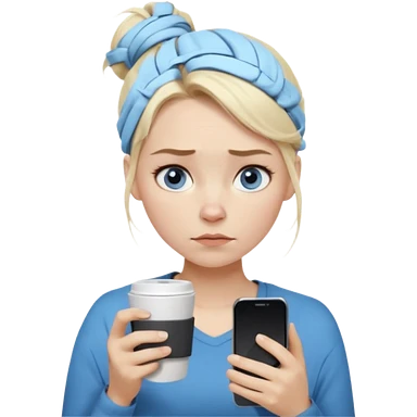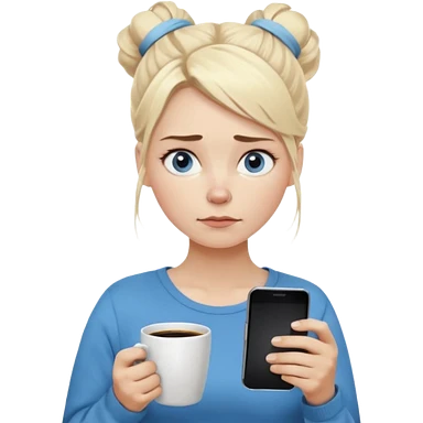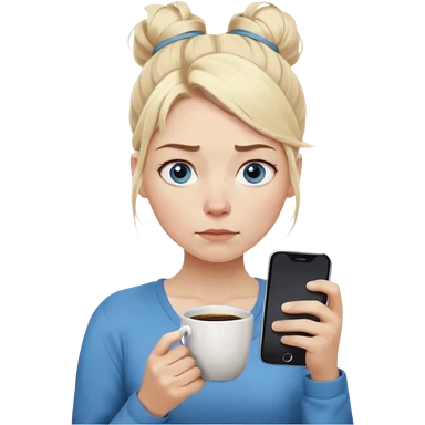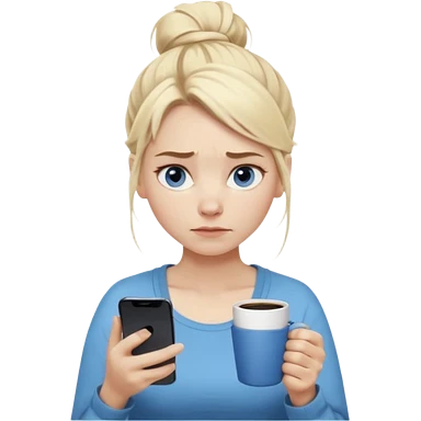 Cartoon emoji of a Scandinavian-looking woman with light blonde hair, pale skin, blue eyes. Portrait mode. Messy bun, tired eyes, tense face. Holding phone and coffee, rushed posture. Clearly busy, overwhelmed, slightly miserable. Smooth, simple, stylized emoji