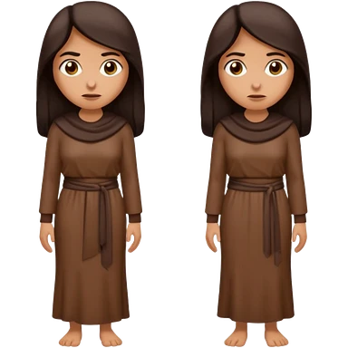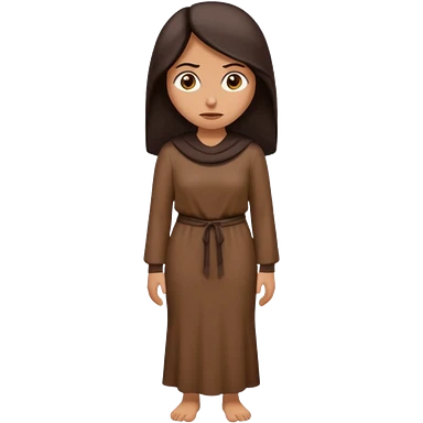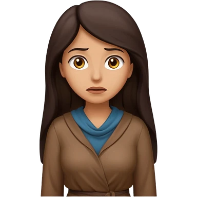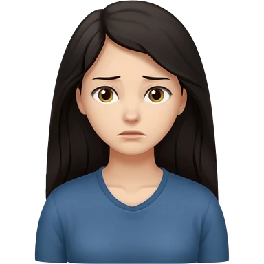 "Cartoon emoji of a woman with long, loose dark hair, wearing plain, simple clothes. Full-height, standing, nervous, unsure, worried expression. Slightly hunched, anxious posture. Smooth, simple, stylized." emoji
