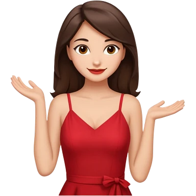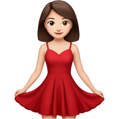 Cartoon emoji of a young brunette woman with fair-medium skin, brown eyes, wearing a red outfit. Full-height, standing confidently in a red dress posing sexy with a smile and relaxed posture. Smooth, friendly, stylized, make up on, flirty eyes and smile emoji