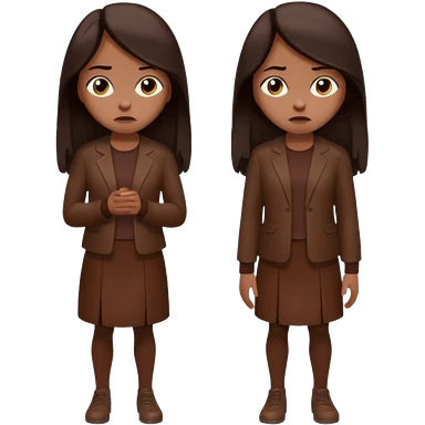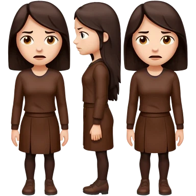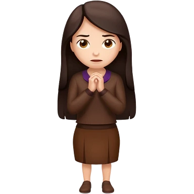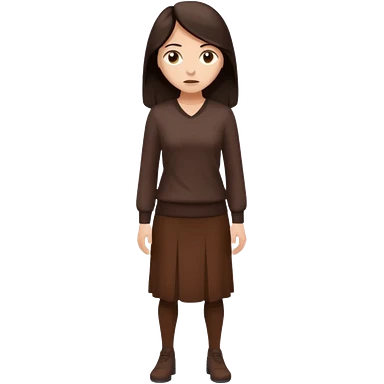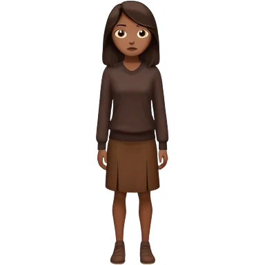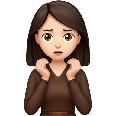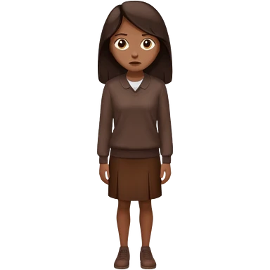 =Cartoon emoji of a woman with long, loose dark hair, wearing chocolate-colored clothes. Full-height, standing, nervous, unsure, worried expression. Slightly hunched, anxious posture. Smooth, simple, stylized emoji