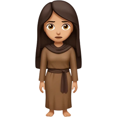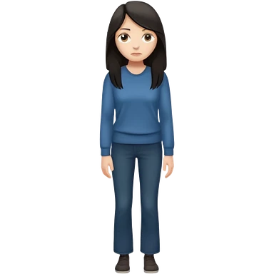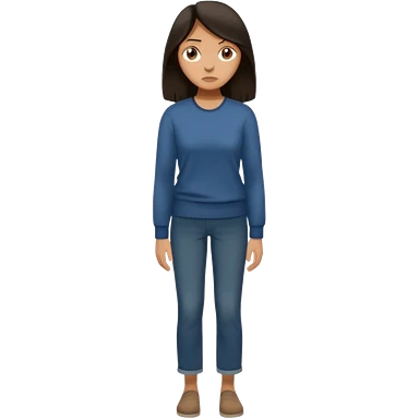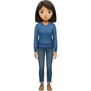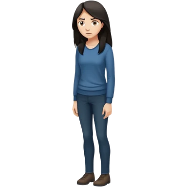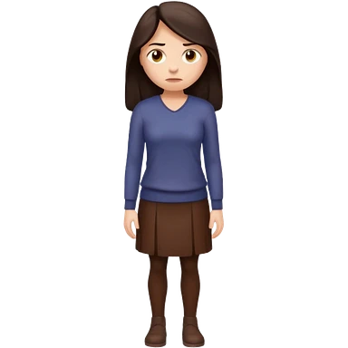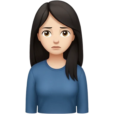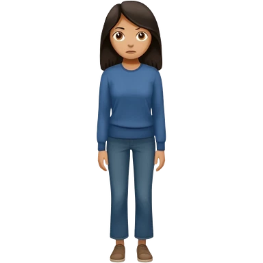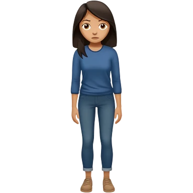 "Cartoon emoji of a woman with long, loose dark hair, wearing plain, simple clothes. Full-height, standing, nervous, unsure, worried expression. Slightly hunched, anxious posture. Smooth, simple, stylized."Eyes looking down or away, avoiding direct contact emoji
