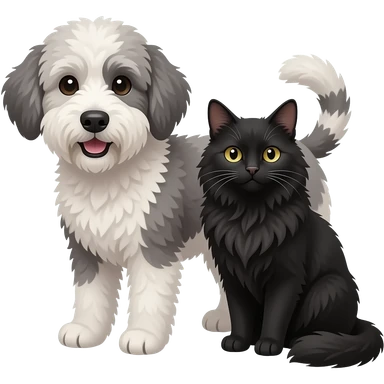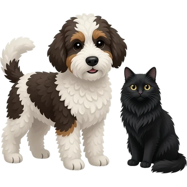 mini merle bernedoodle next to a long haired black cat emoji