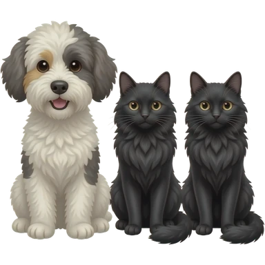 mini merle bernedoodle next to two long haired black cats emoji