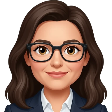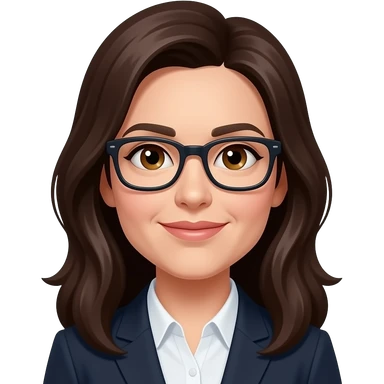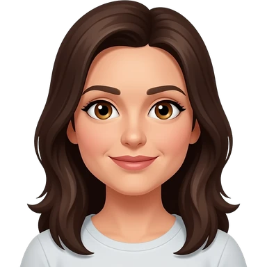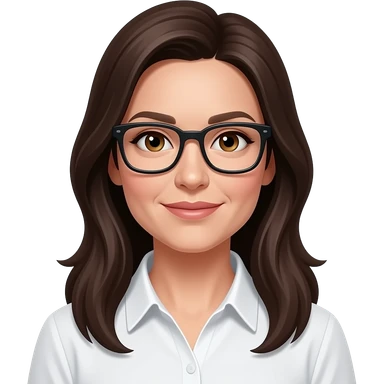 42 year old woman with hazel eyes and dark brown long hair with black rectangle glasses with a white normal shirt emoji