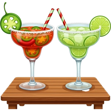 one spicy margarita, green marg with tajin rim, no garnish but jalepeno slices inside, and one regular margarita next to eachother and one regular margarita cheersing emoji