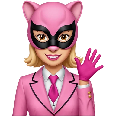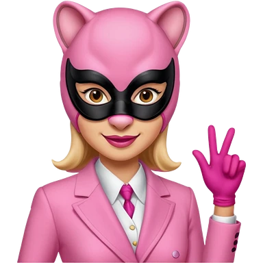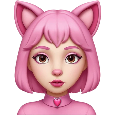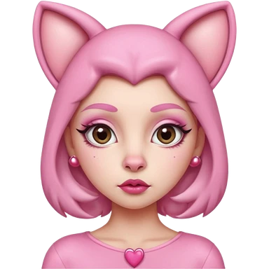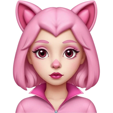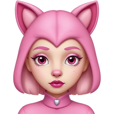 A woman dressed as a pink panther with soft pink skin, big expressive eyes, and glossy lips has a calm, pouty look. Pink animal ears and subtle heart details give her a sweet, playful vibe emoji