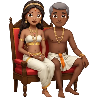 an indian bride sitting on her fathers lap. father is wearing a dhoti, shirtless and sitting on a chair emoji
