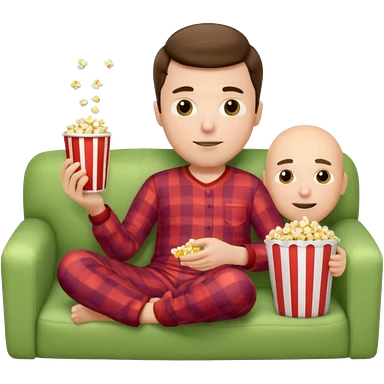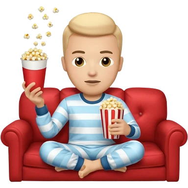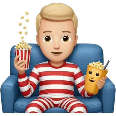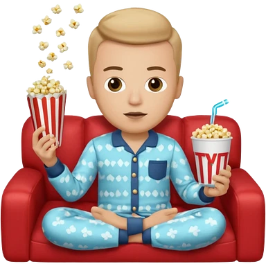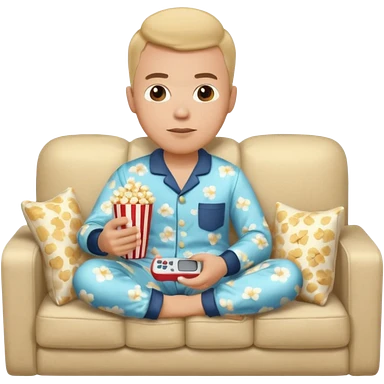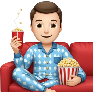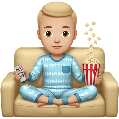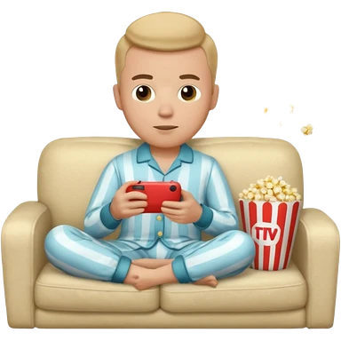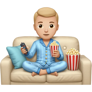male memoji, in pajamas, sitting on couch, holding TV remote controller, relaxed face, casual home vibe, popcorn bucket on couch emoji
