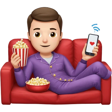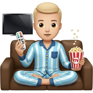 male memoji, lazy man in pajamas, lying on couch, holding TV remote, relaxed face, casual home vibe, popcorn bucket emoji